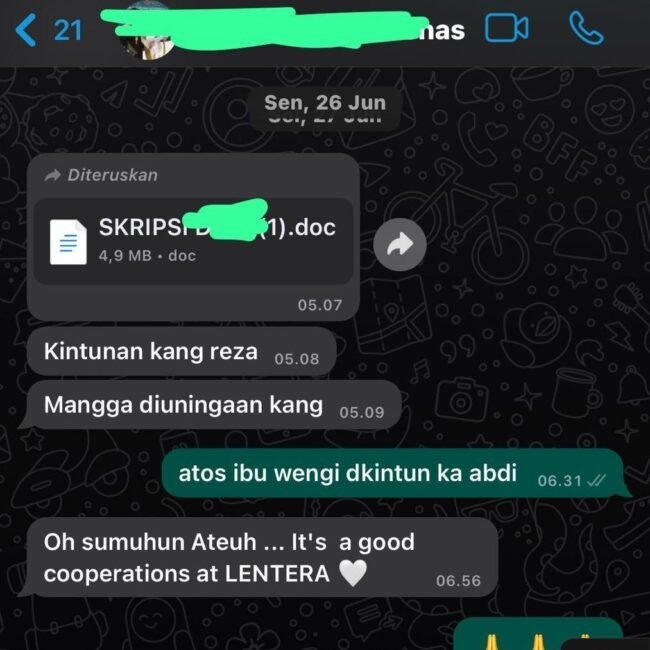 Di Jasaskripsibandung.com, kami tidak menyediakan layanan joki. Setiap bimbingan bersifat elaboratif dan kolaboratif, di mana mahasiswa dan mentor bekerja saling berdiskusi dan mengembangkan ide bersama. Kamu tetap menulis skripsi sendiri, sementara mentor memberikan arahan, saran metodologi, dan perbaikan yang membuat hasil skripsi bisa dipertanggungjawabkan secara akademik. Dengan pendekatan ini, proses belajar tetap berjalan, kualitas tugas akhir terjaga, dan integritas akademik tetap aman.